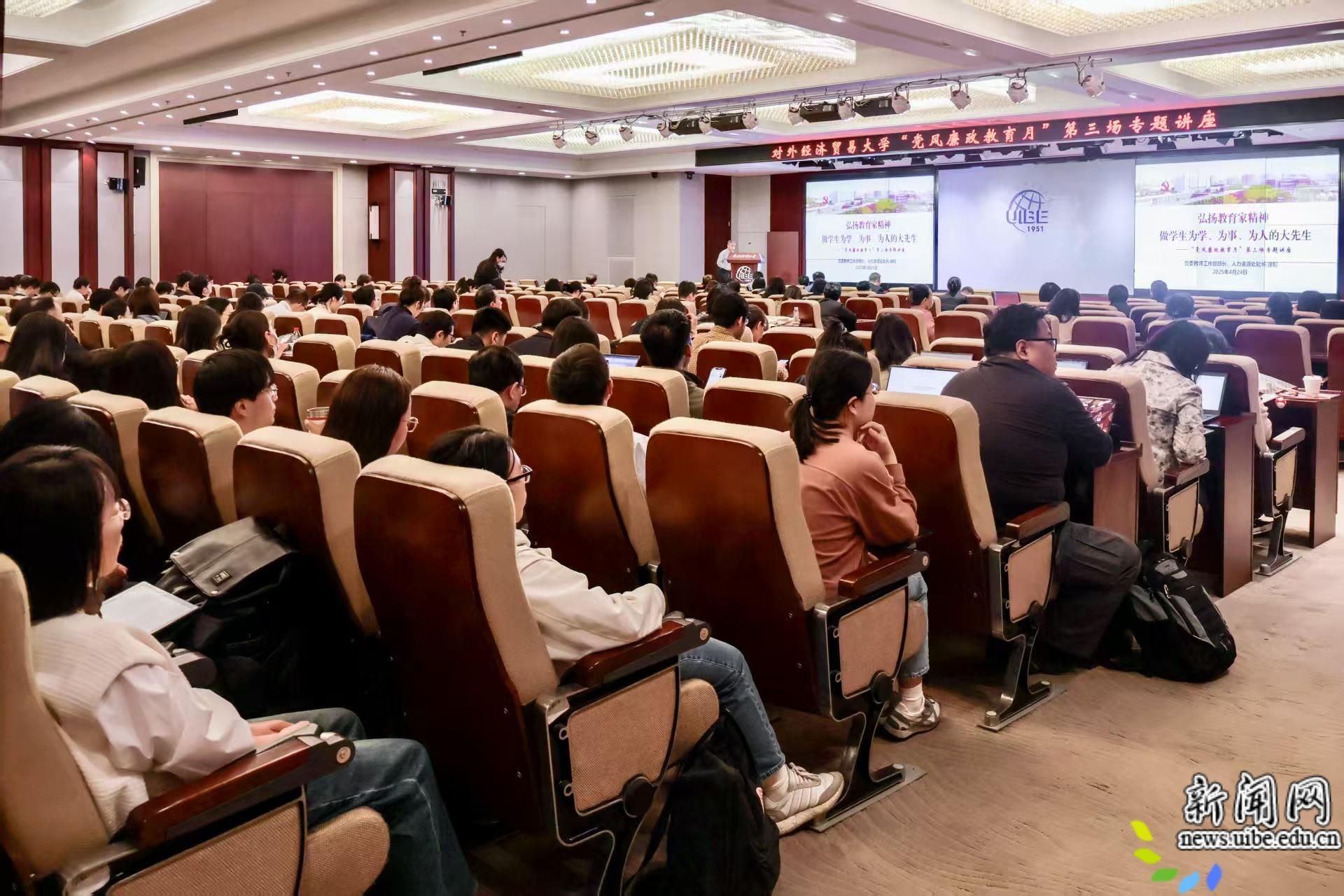 校新闻网讯(纪委办/监察处供稿 摄影 关孟茜)4月24日下午,学校“党风廉政教育月”系列讲座第三场专题报告在国际交流大厦二层报告厅举行,党委教师工作部部长、人力资源处处长徐松围绕“弘扬教育家精神,做学生为学为事为人的大先生”作专题讲座。基层党委(党总支、直属党支部)书记、各学院教师思政和师德师风建设工作联络人、各学院本科生、硕士生、博士生导师代表230余人现场参加。副校长兼党委副书记文君、党委副书记、纪委书记马贵生出席专题讲座,纪委办主任、监察处处长胡守强主持。